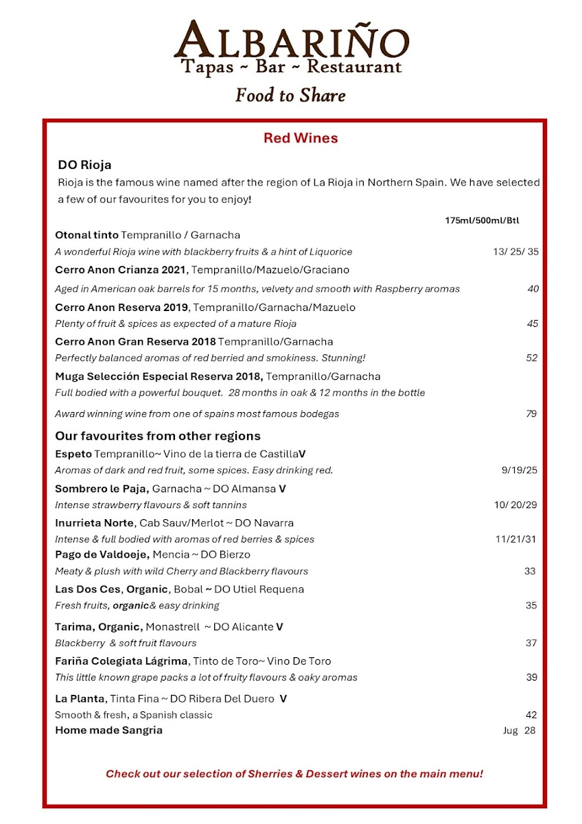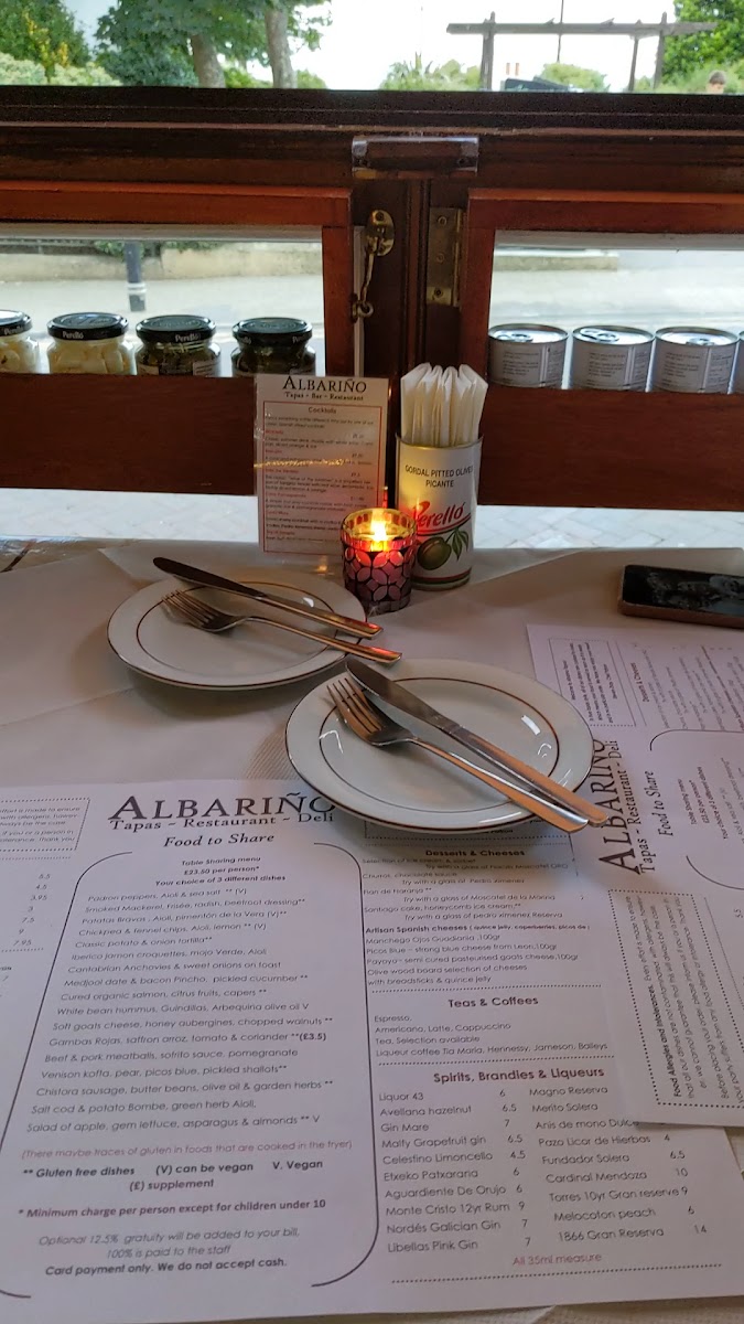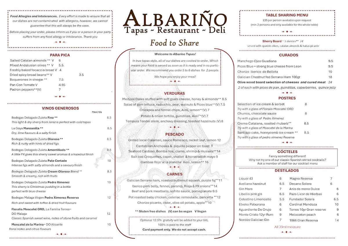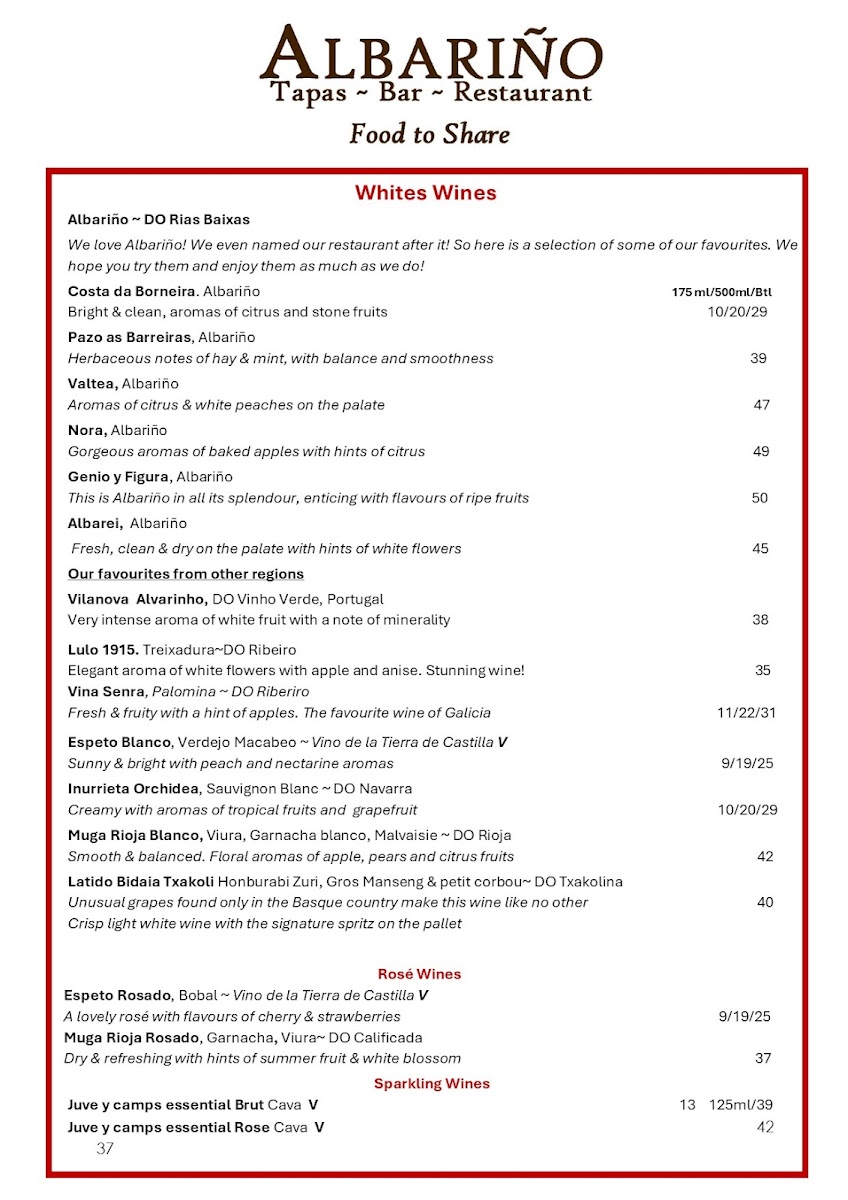 The menu at Albariño Tapas offers a delightful array of Spanish-inspired dishes that showcase rich, vibrant flavors. For a light bite, you can enjoy Salted Catalan almonds or Mixed Andalusian olives, while heartier options like Grilled local Calamari with sauce Romesco and Seafood Caldoso with Bomba rice, clams, shrimp, and mussels are sure to impress. The Chickpea and fennel chips served with aioli and the Potato & onion tortilla with guindillas are excellent vegetarian choices. Meat lovers will appreciate the Galician Serrano ham, Iberico pork belly, and Beef and pork meatballs in sofrito sauce. For dessert, indulge in Churros with chocolate sauce or a slice of Santiago cake paired with honeycomb ice cream. The restaurant also boasts a curated selection of wines, including various Albariños such as Pazo as Barreiras and Valtea, as well as robust reds like Cerro Anon Crianza 2021. Whether you're in the mood for tapas, seafood, or traditional Spanish sweets, Albariño Tapas delivers a memorable dining experience.