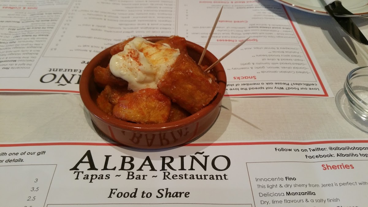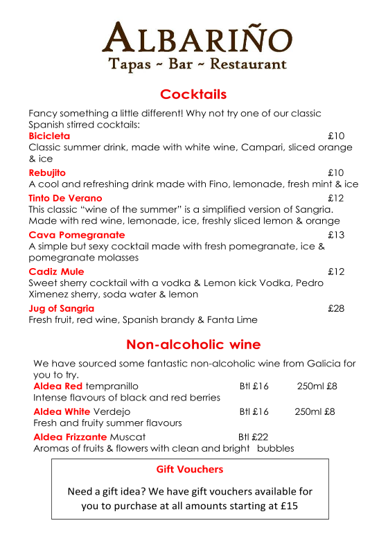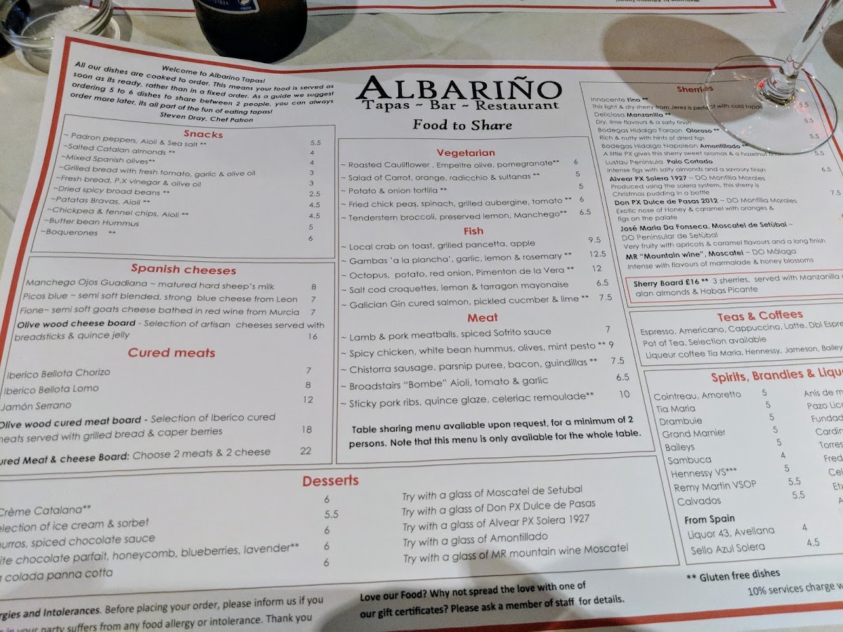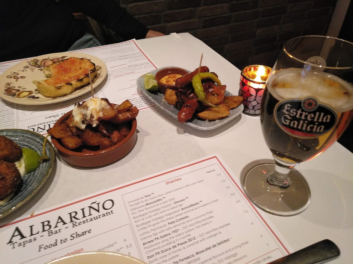 The menu at Albariño Tapas offers a delightful array of Spanish-inspired dishes that showcase rich, vibrant flavors. For a light bite, you can enjoy Salted Catalan almonds or Mixed Andalusian olives, while heartier options like Grilled local Calamari with sauce Romesco and Seafood Caldoso with Bomba rice, clams, shrimp, and mussels are sure to impress. The Chickpea and fennel chips served with aioli and the Potato & onion tortilla with guindillas are excellent vegetarian choices. Meat lovers will appreciate the Galician Serrano ham, Iberico pork belly, and Beef and pork meatballs in sofrito sauce. For dessert, indulge in Churros with chocolate sauce or a slice of Santiago cake paired with honeycomb ice cream. The restaurant also boasts a curated selection of wines, including various Albariños such as Pazo as Barreiras and Valtea, as well as robust reds like Cerro Anon Crianza 2021. Whether you're in the mood for tapas, seafood, or traditional Spanish sweets, Albariño Tapas delivers a memorable dining experience.